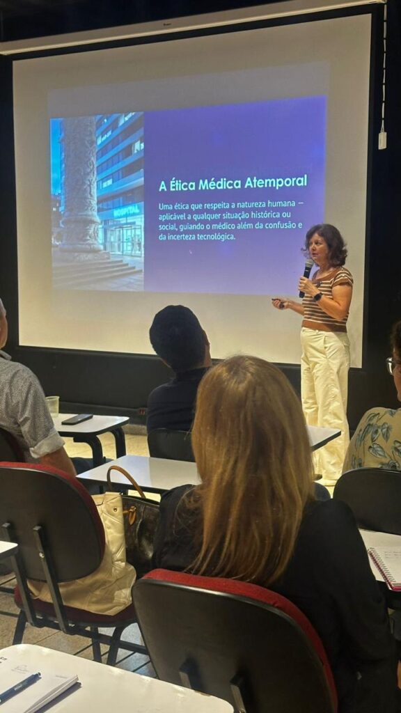 A primeira aula foi realizada de forma presencial, conduzida pela médica Dra. Ana Cristina Machado, e contou com grande participação e interação dos docentes, evidenciando o interesse por uma abordagem mais humanista e integral da medicina.