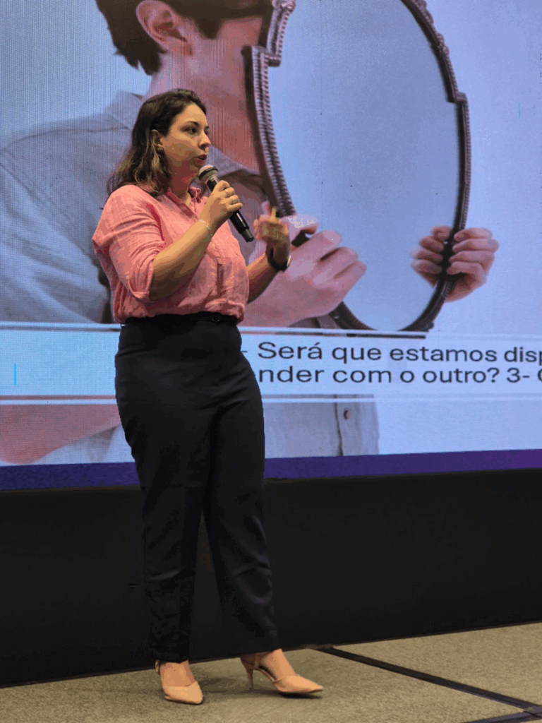 Em sua fala, Ingrid destacou que o processo educativo não acontece apenas nos livros ou nas salas de aula, mas também — e sobretudo — na convivência humana. Segundo ela, aprender com o outro implica reconhecer que cada pessoa carrega uma experiência única, capaz de ampliar nossa visão de mundo e revelar aspectos que muitas vezes não enxergamos sozinhos.