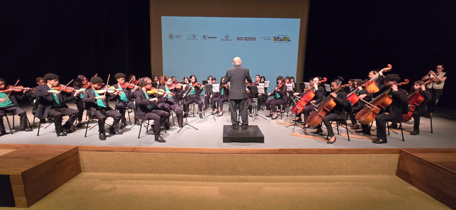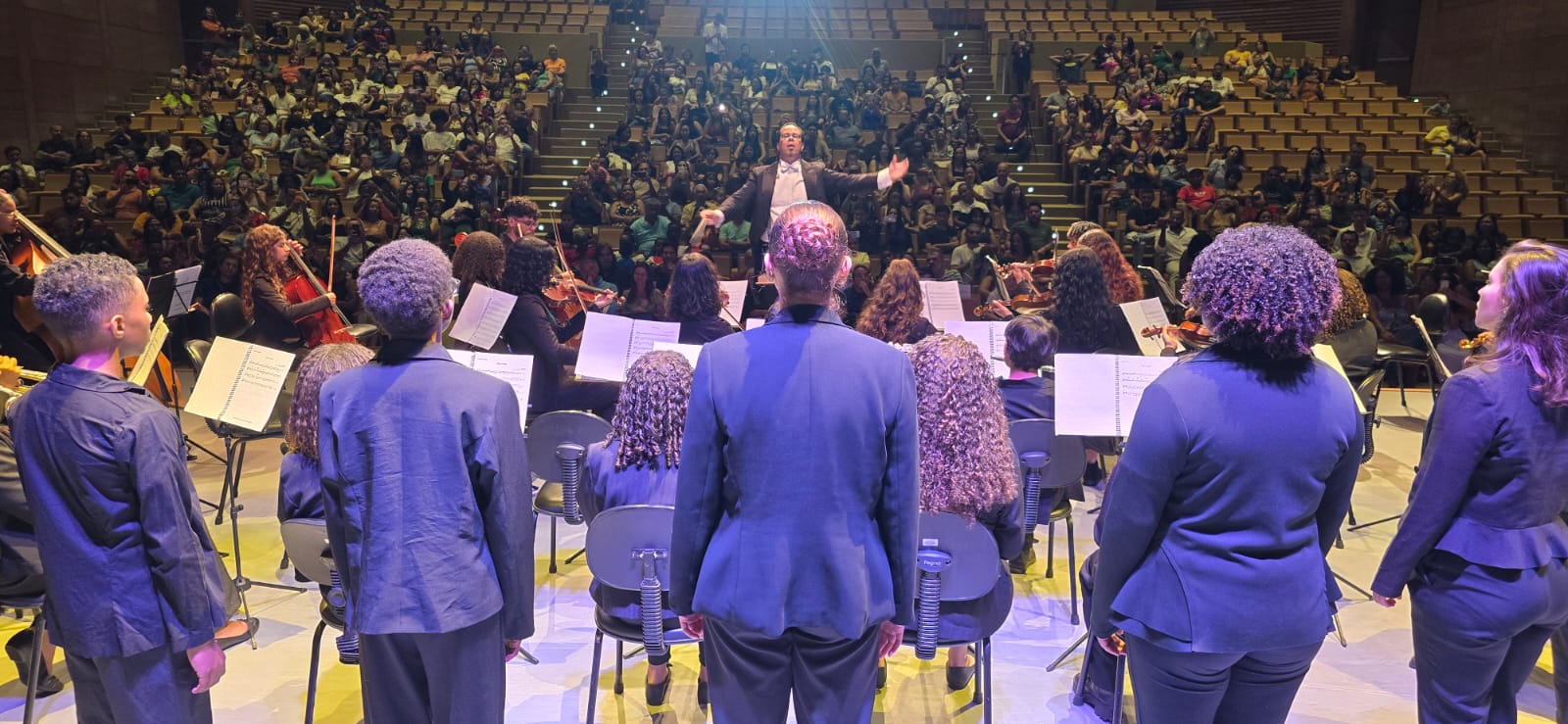 Em seguida, a Orquestra Filarmônica Juvenil, formada por 55 integrantes, emocionou o público sob a regência dos maestros Ricardo Sousa-Castro e Mário Brasil. Obras de Tchaikovsky, Mozart, Haydn e James Pierpont ecoaram pelo auditório com precisão, musicalidade e profunda harmonia, refletindo a potência transformadora da educação musical.